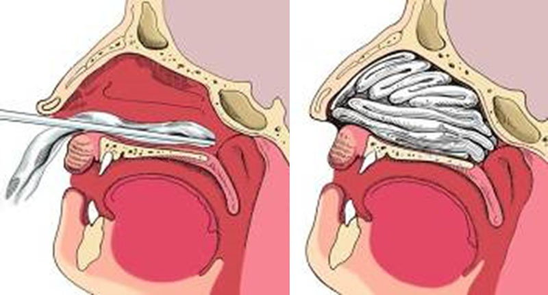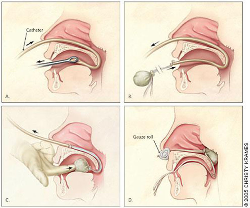 Kỹ thuật nhét meche mũi sau: ngăn không cho máu chảy xuống thành sau họng bằng cách dùng cục gạc to, đường kính khoảng 2-2,5 cm, cao khoảng 2,5 cm có buộc dây ở giữa, mỗi đầu dài khoảng 30 cm để bịt kín cửa mũi sau. Sau đó, ta nhét tiếp meche mũi trước. Giữ nguyên meche mũi sau khoảng 48-72 tiếng. Cần dùng kháng sinh trong thời gian này.